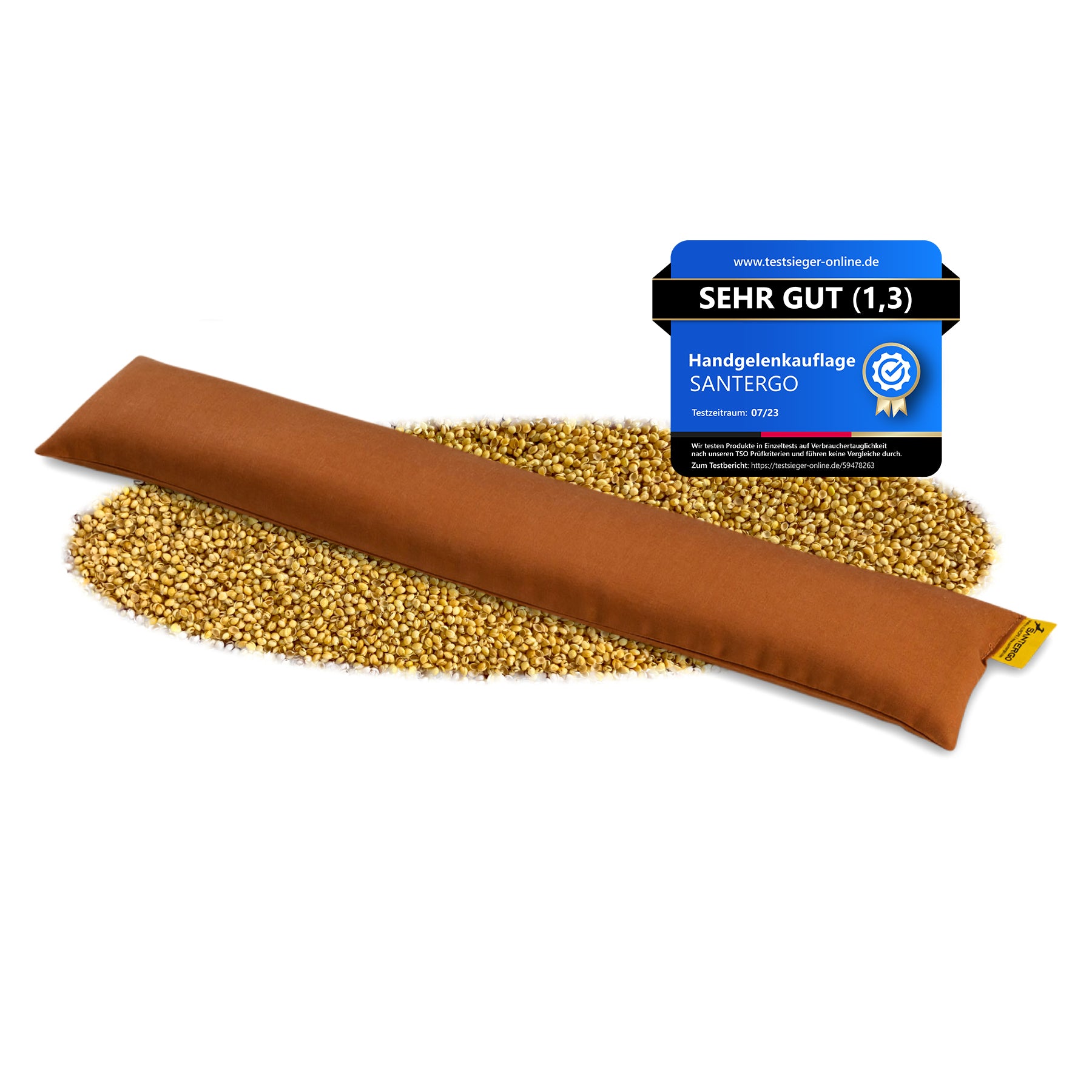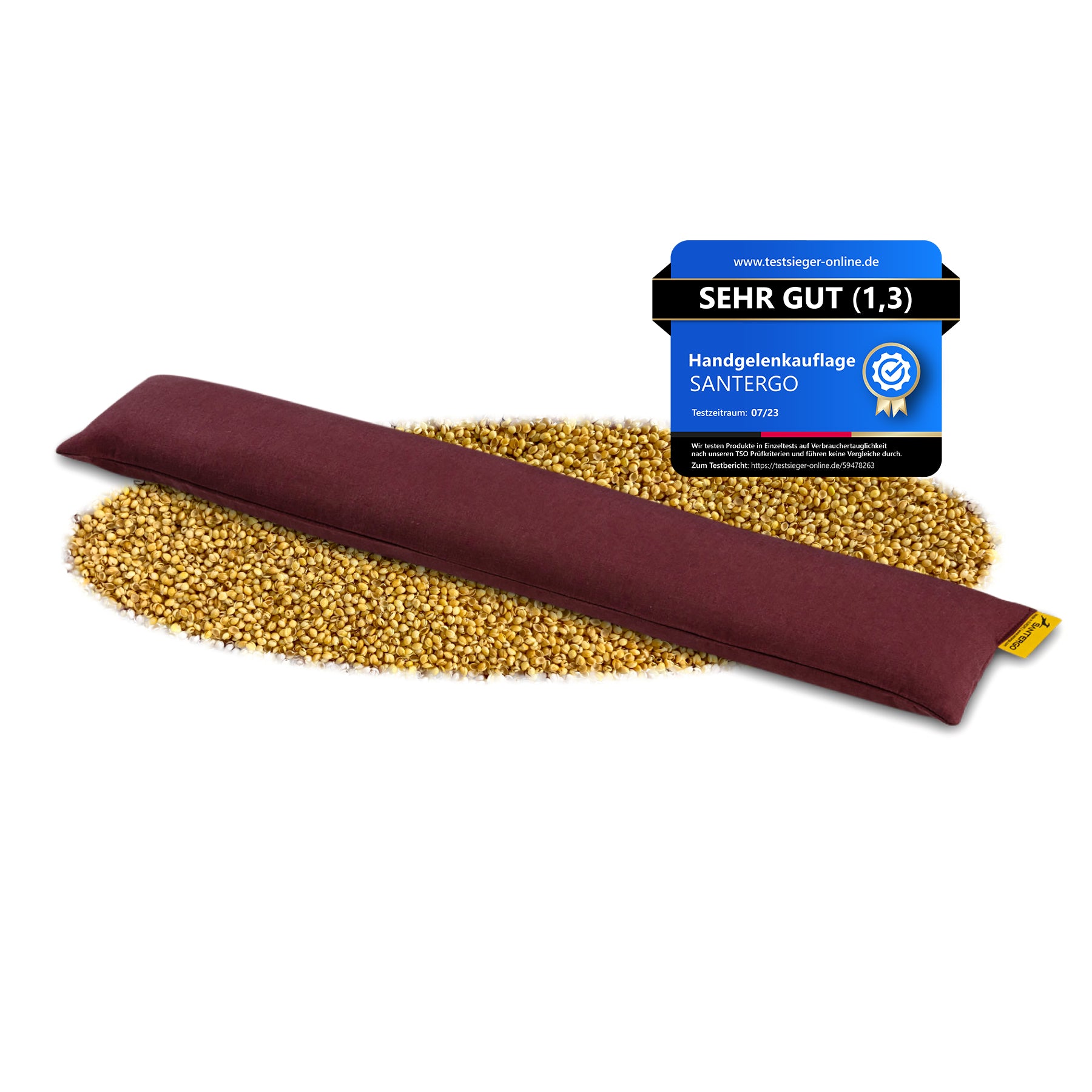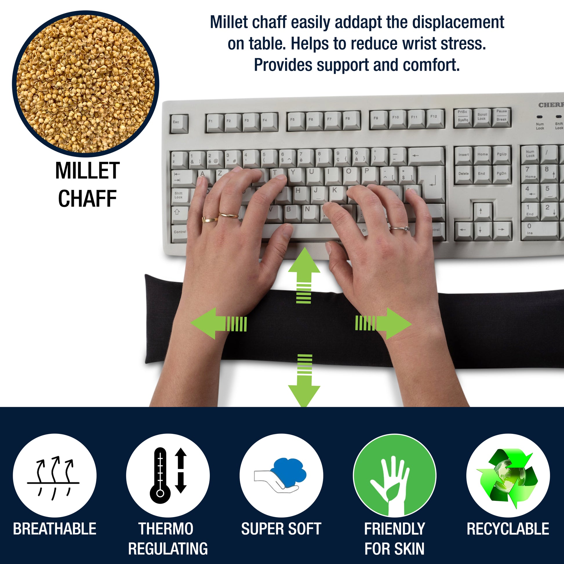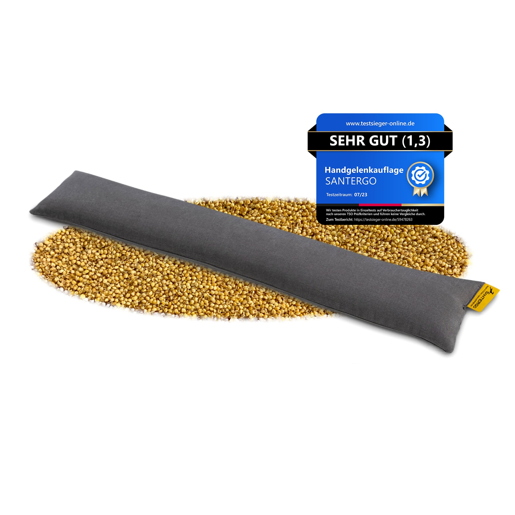 Die Füllung ist nicht chemisch, sondern besteht aus Bio-Hirsespreu, die sich luftig und angenehm anfühlt, beruhigend wirkt und sich jedem Handgelenk individuell anpasst.